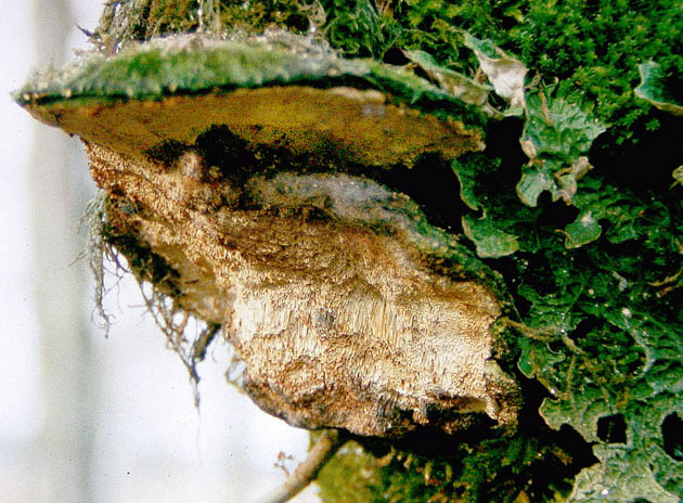 Coriolopsis gallica Brun borstticka kopiera.jpgCoriolopsis gallica Brun borstticka, mycket sällsynt, här övervuxen av den sällsynta Lunglaven