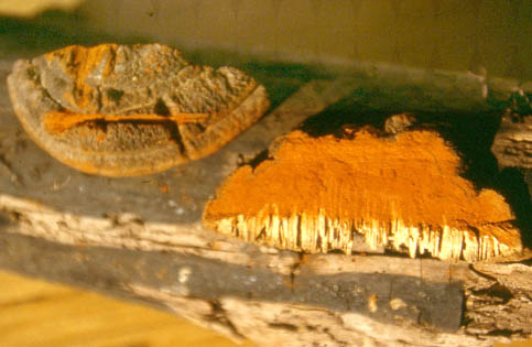 Echinodontium tinctorium, " INDIAN PAINT FUNGUS" är en nordamerikansk " ticka" en hård svamp, och istället för porer så har den taggar. Kan det ha varit så att indianbarn föds vita, och att de sedan doppas i färgbad för att få den röda färgen? Vet inte annars vad namnet syftar på, kanske krigsmålning? om man drar med fingret mot det röda köttet får man massor av rött pigment på det, att måla sig i ansiktet med.