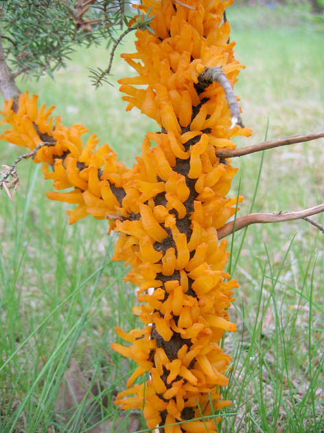 Gymnosporangium clavariforme Hagtornsrost, denna svamp ser du på enbuskar på våren, den hör till Rostsvamparna, första gången jag såg den trodde jag att det var en fingersvamp som krypit upp i enen