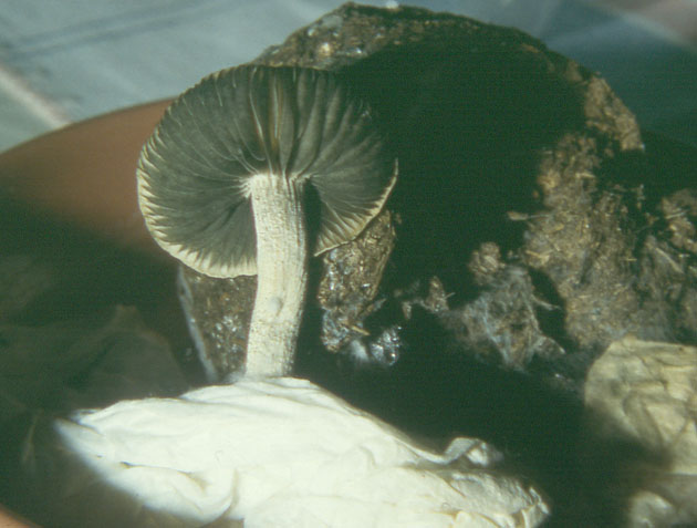 Panaeolus cyanescens, denna svamp finns inte i Sverige annat än i hemliga odlingar, det är en knarksvamp, denna har jag odlat fram själv, på den tiden den var laglig att inneha.Det var mycket knarksvamp jag fick sätta namn på när jag var på museet, oftast så var dom lagliga så den som förde in dem i Sverige fick tillbaka svampen av tullkriminalen. Nu är det ämnena Pilocybin och Pilocin (de aktiva knarkämnena i dessa svampar) förbjudna ,så myndigheterna har lättare att se vad som är knarksvamp eller inte