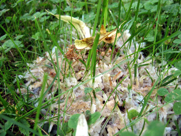 Sebacina incrustans Talgsvamp, denna ser mera ut som en spya som blivit kvar i gräset, konsistensen om man tar på den känns som talg