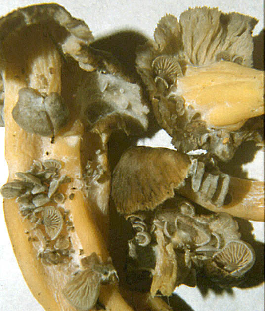 Entoloma pseudoparasiticus, är den lilla musslingen som växer på trattkantarellen