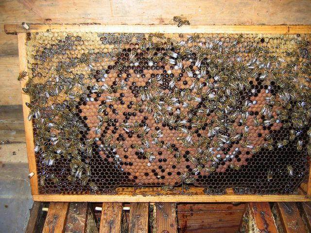 så här ser en ram ut, överst på kakan finns det honung, det bruna är täckta yngelceller