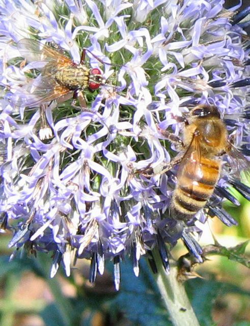 Bi och blomfluga i bolltistel