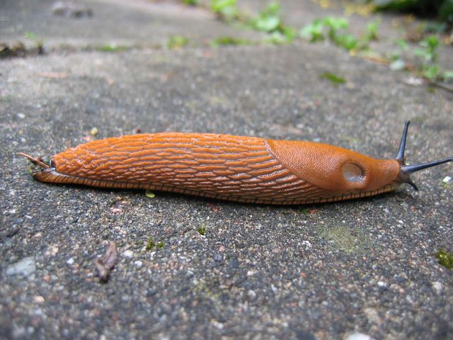 Spansk skogssnigel, Mördarsnigel. i början på sommaren (i allafall hemma hos mej) är de flesta djuren bruna, närmare hösten är de flesta så här vackert orange