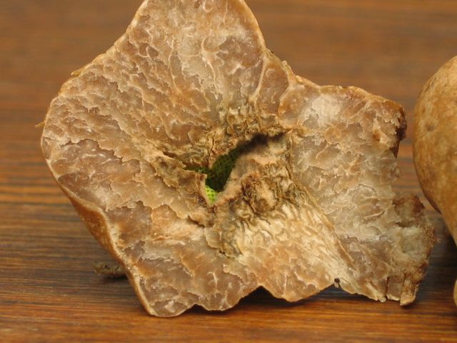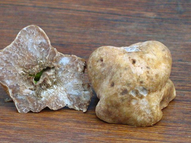 Två tryfflar har jag fått hemsända för artbestämmning denna kom från Östergötland , den har en djup navel .hålet i mitten , jag fick bara en svamphalva